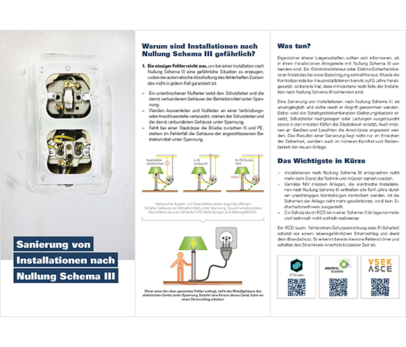 Installationen nach dem sogenannten Nullung Schema III stellen ein erhebliches Sicherheitsrisiko dar und entsprechen schon lange nicht mehr dem Stand der Technik. Electrosuisse hat in Zusammenarbeit mit EIT.swiss und VSEK einen kompakten Informationsflyer erarbeitet, der Elektrofachleute dabei unterstützt, Hauseigentümer sachlich über den Sanierungsbedarf zu informieren.